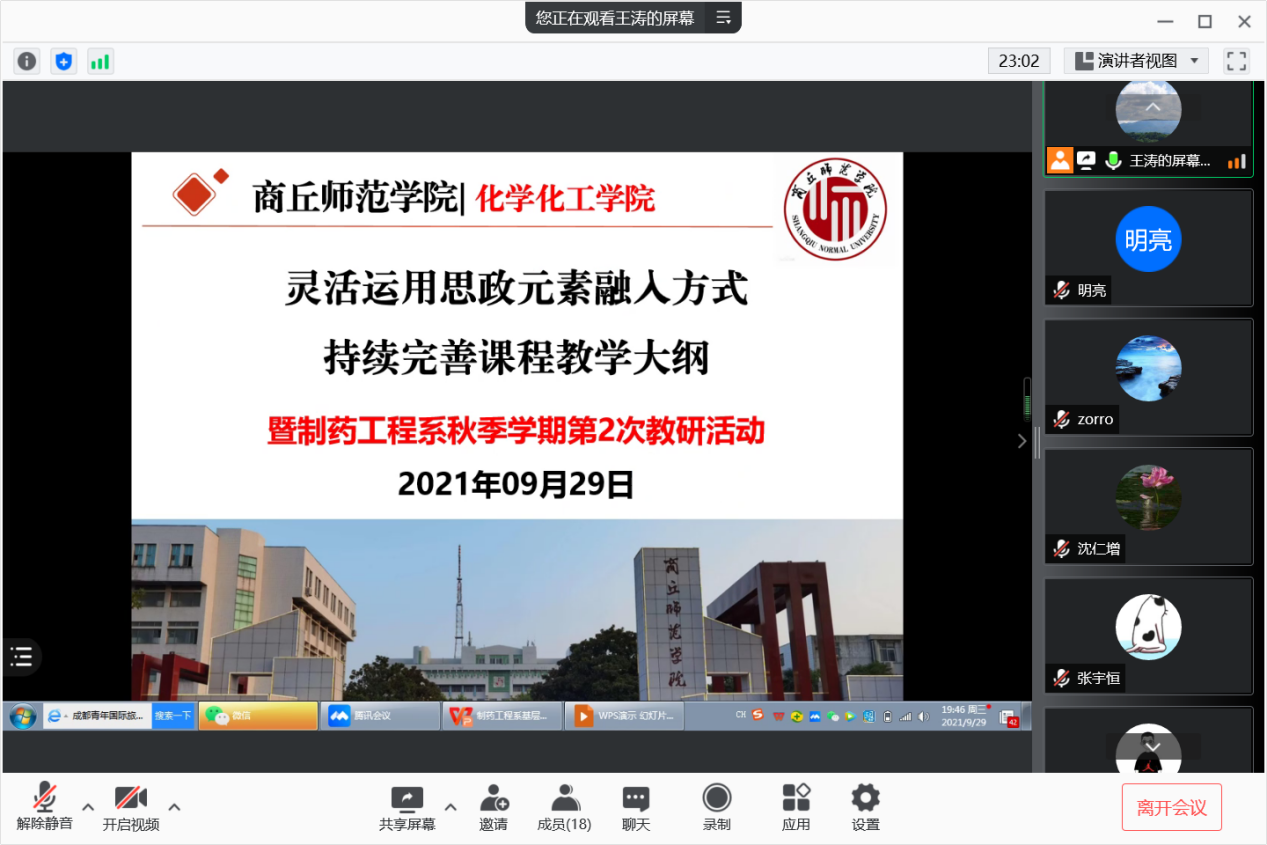 为深入贯彻落实习近平总书记关于教育的重要论述和全国教育大会精神,根据学校加强课程思政建设的相关部署,09月29日,制药工程系利用腾讯会议召开了以“灵活运用思政元素融入方式、持续完善课程教学大纲”为主题的教研活动。本次教研活动由beat365英国官网网站副院长、制药工程系主任王涛老师主持,制药工程系全体老师参加。