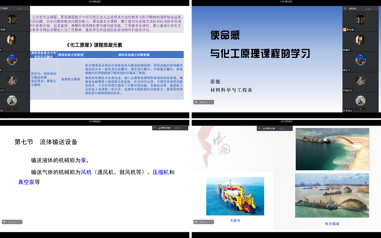 首先,张弛老师分享了《化工原理》课程中思政元素融入的整体构思,并以流体输送设备这一节内容为例,在讲授离心泵的构造和工作原理时融入吹沙填海的原理、我国吹填技术的发展和南海吹沙填海的奇迹,增强学生的民族自信心,培养爱国主义精神。之后,孙家书老师、臧运波老师、刘起峰老师结合自己的教学经验讲述了思政元素融入《化工原理》课程的心得体会,大家针对思政元素如何融入课堂以及如何进行考核做了激烈讨论。