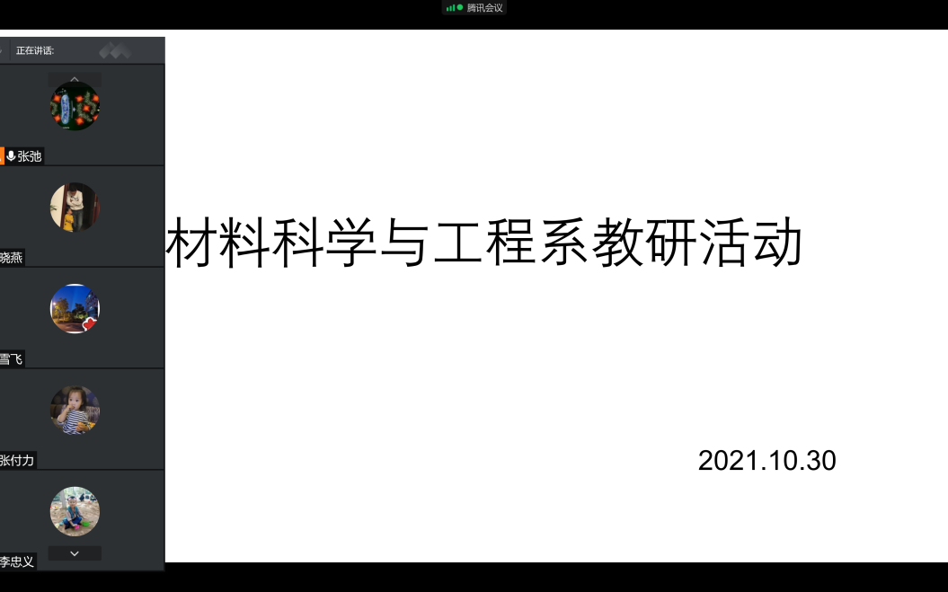 10月30日,材料系利用腾讯会议在线召开了2021-2022学年第一学期的第四次教研活动。教研活动由系主任张弛老师主持,材料系全体老师参加此次活动。