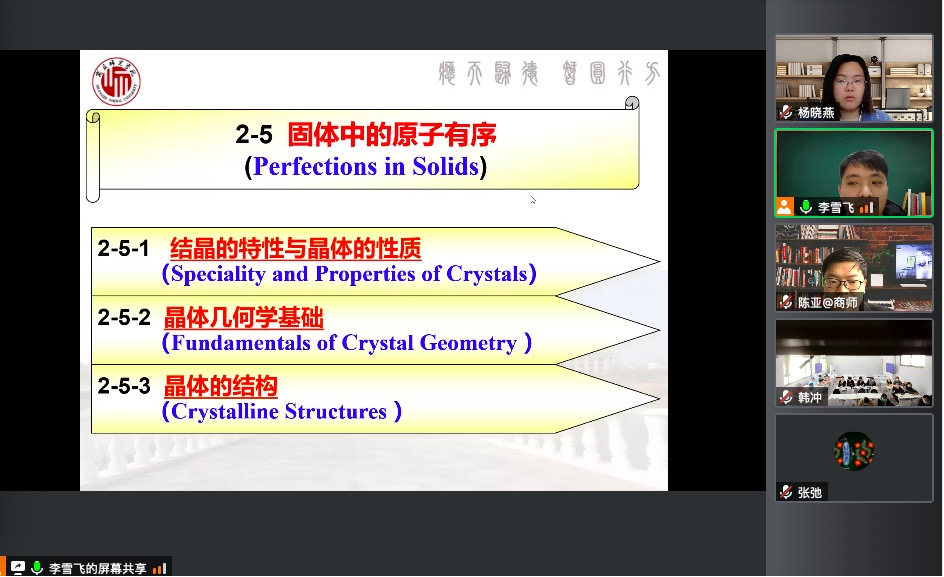 4月7日,beat365英国官网网站青年教师李雪飞通过线上授课的方式进行了《材料科学基础》公开课。副院长王涛、指导老师杨晓燕、院督导团成员张弛、系主任陈亚以及课程组部分老师在线上进行了听课指导。