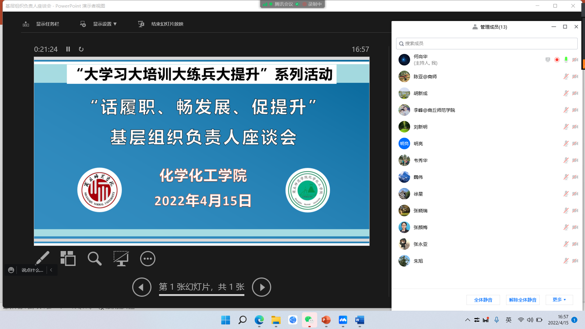 4月15日,beat365官网召开“话履职、畅发展、促提升”基层组织负责人培训交流座谈会,会议以线上线下相结合的形式进行,学院领导班子成员、基层教学组织负责人出席会议,会议由副院长王涛主持。