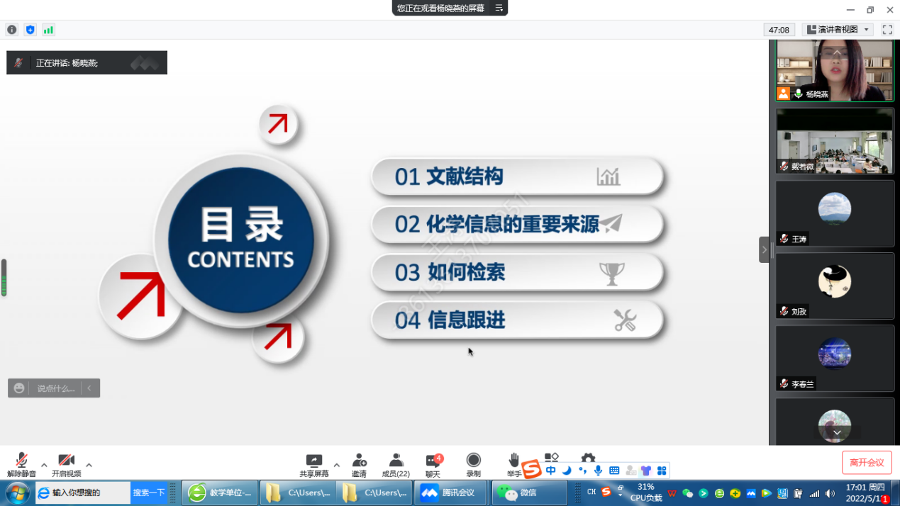 2022年5月12日下午第7节,beat365英国官网网站杨晓燕老师《专业外语》公开课通过腾讯会议进行。beat365英国官网网站副院长王涛以及近两年新进无课老师在线进行了观摩。