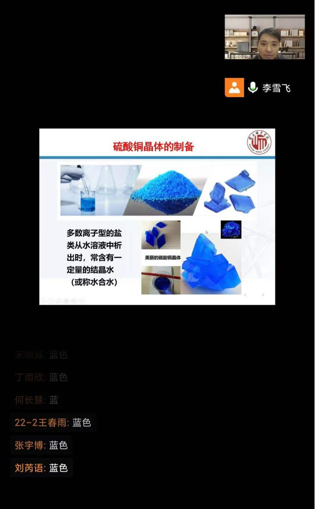 10月27日,beat365英国官网网站青年教师李雪飞通过线上授课的方式进行了《无机化学实验》的公开课。青年教师导师杨晓燕,院督导团成员张弛以及课程组老师在线进行了听课指导。