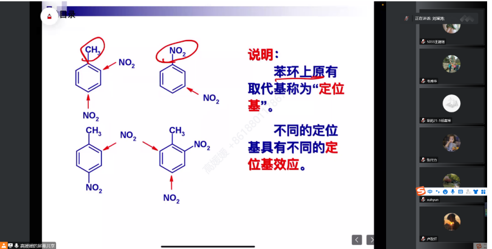 本次公开课的内容是单环芳烃的化学性质。高老师课前先带领学生回顾烯烃和炔烃等富电子基团的化学性质,由此引出芳环上可能发生的加氢和亲电反应。接着系统讲解了芳环发生亲电取代反应的过程和机理,并对反应过程中产生的中间体做了详细讲解。之后通过对硝化反应的介绍和讲解,让学生对亲电取代反应的机理有了更深刻的认识。在此过程中针对一些重要的知识点对学生进行抽查提问,教学环节过渡自然,循序渐进。