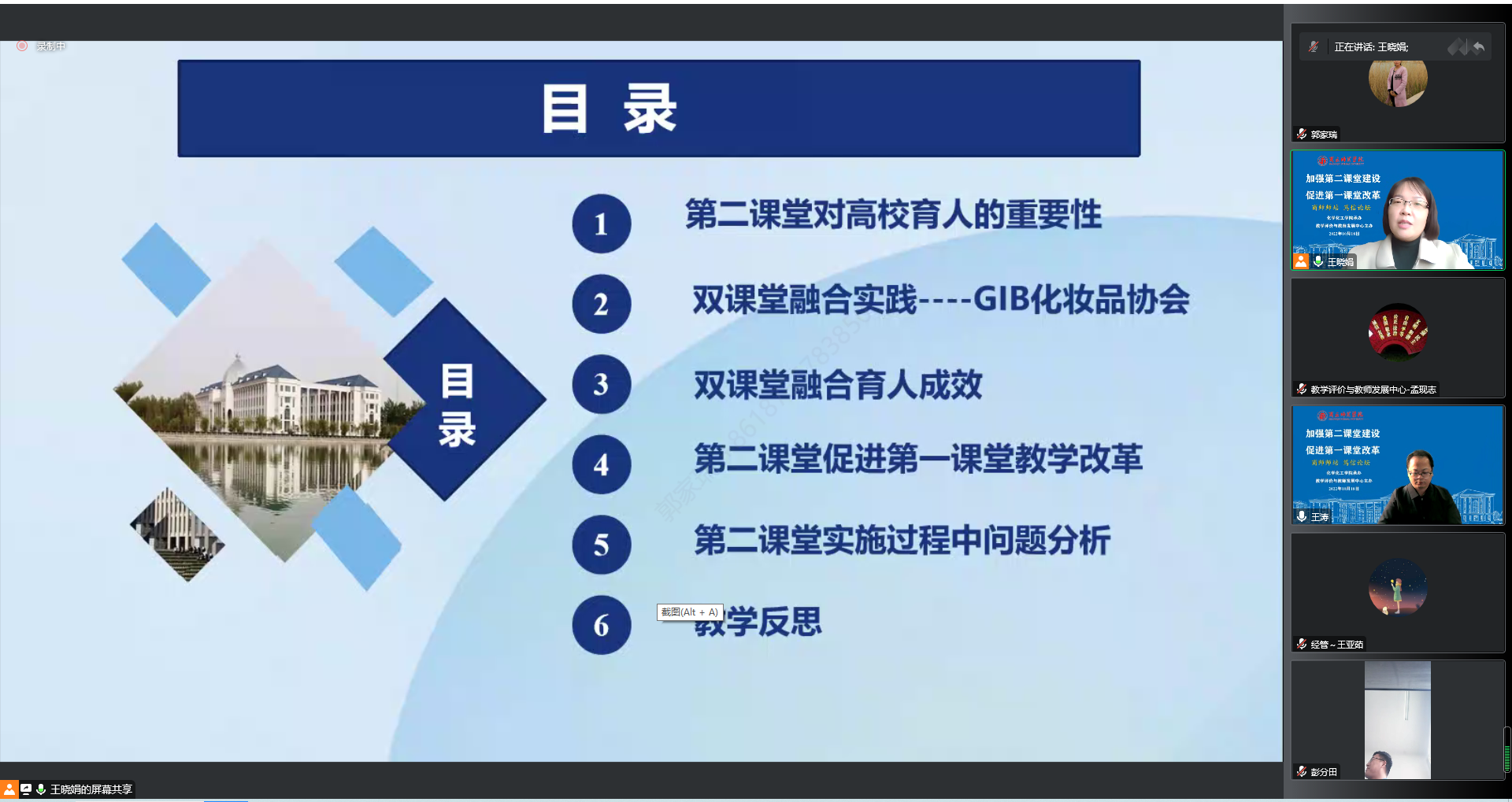 接下来,王涛向大家介绍了主讲人王晓娟老师的基本情况,王晓娟从教10年,在重视第一课堂教学的同时,持续指导学生围绕专业培养目标,开展第二课堂实践活动,通过第一课堂、第二课堂的相互融合促进,教学成果突出,育人成效显著。王晓娟根据自己指导的GIB化妆品协会的发展为轴,介绍了第一课堂理论教学如何指导第二课堂实践活动,第二课堂又是如何促进第一课堂教学改革。最后通过第二课堂实施过程中的问题分析和教学反思,倡导一线专业课老师在站稳第一课堂的同时,要尽量为学生搭建“以知识为牵引,兴趣为导向”的第二课堂,提高两个课堂协同育人能力。