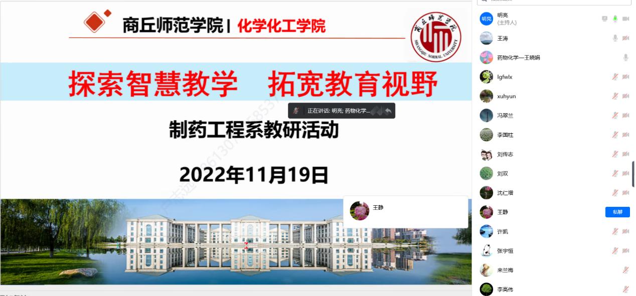 11月19日下午,制药工程系在线召开“探索智慧教学、拓宽教育视野”教研活动,副院长王涛和制药工程系全体老师参加了此次活动,活动由系副主任张明亮主持。