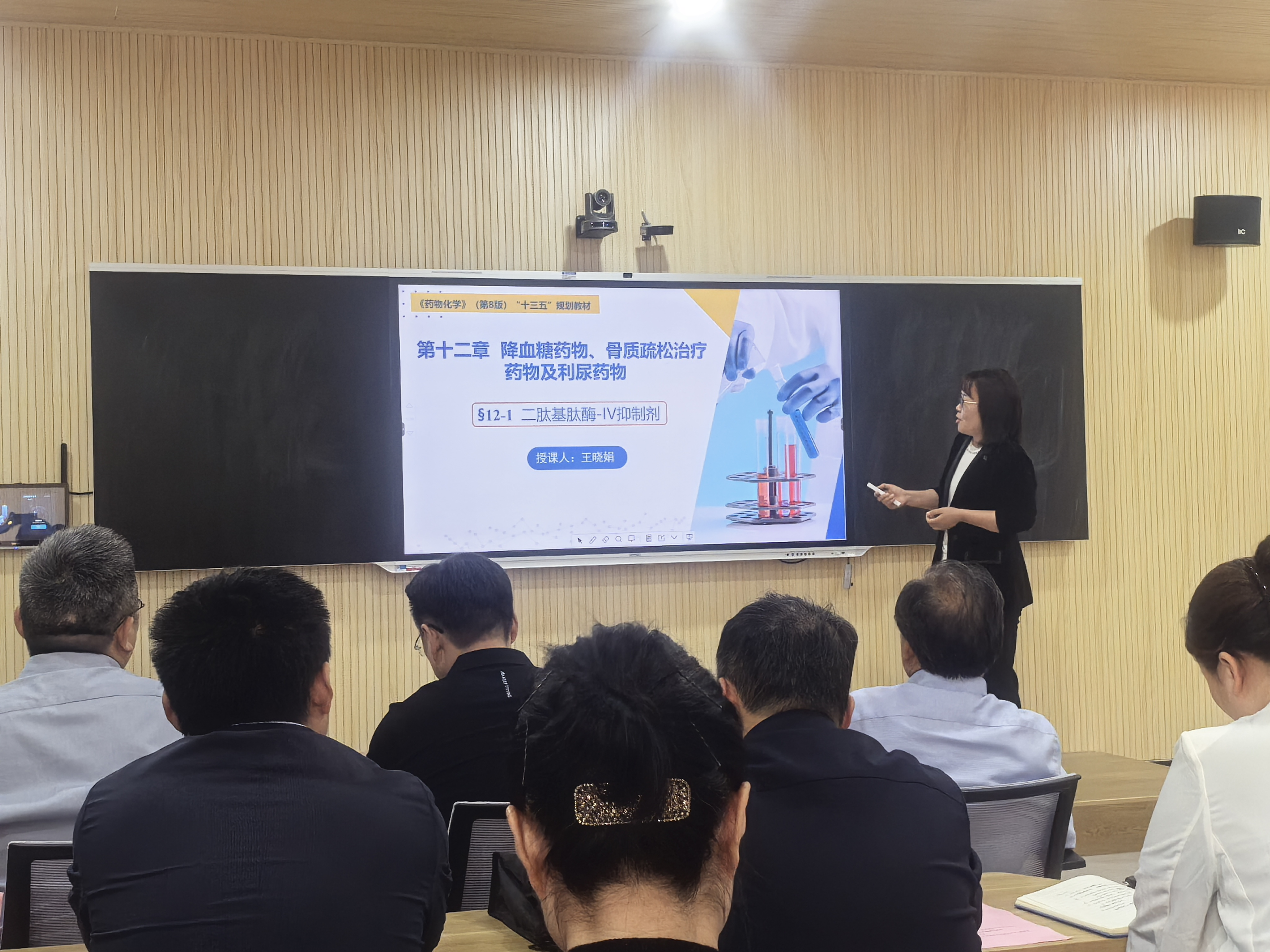 研讨会上,beat365官网王晓娟老师以《新型降血糖药物--DPP-IV抑制剂》为题进行教学示范。课堂紧扣专业知识点,巧妙融入家国情怀、科技创新、科学家精神等思政元素,结合学科发展史中科学家攻坚克难的故事,诠释精益求精的工匠精神。课堂采用“问题链+情景模拟”互动模式,实现了知识传授与价值引领的有机统一。