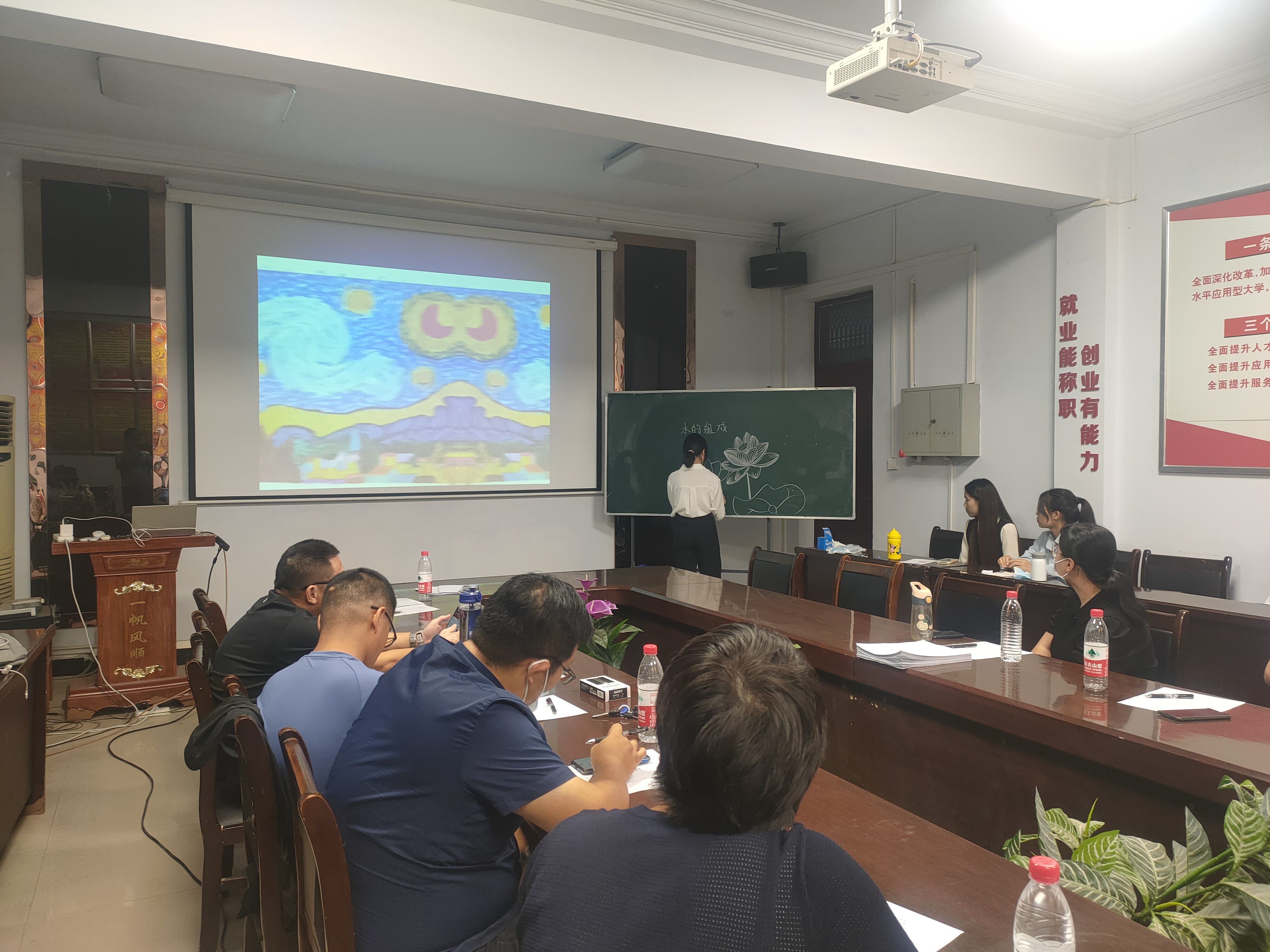 本次比赛共设置3个环节,分别为说课、答辩、才艺展示。比赛前,参赛选手准备工作已完成,精神状态良好。比赛过程中,选手们在说课环节使用粉笔板书教学提纲,充分体现了其粉笔字的深厚功底;在答辩环节,选手们根据说课内容及自身知识储备和经验,流畅地回答评委老师提问的问题,评委老师也对参赛选手的教学设计、教学方法、教学内容、教学理念等方面表示肯定和赞扬;在最后的才艺展示环节,选手们选择了器乐演奏、舞蹈、朗诵、绘画等方面的技能进行展示,充分展示了当代大学生的艺术风采及良好精神风貌。