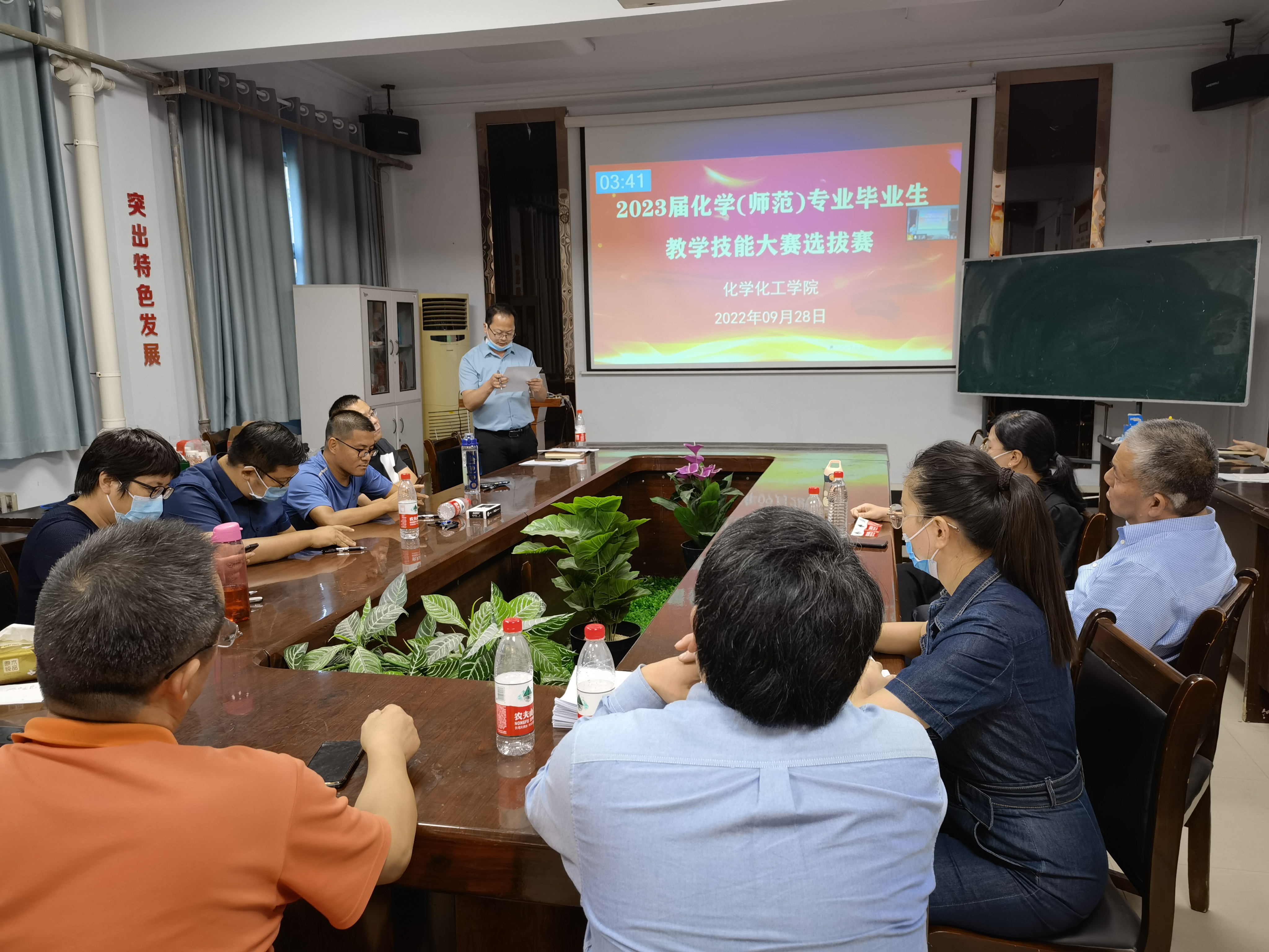 为加强beat365官网化学专业教育实习工作,切实提高化学师范生教学技能,选拔优秀选手参加河南省第二十届师范教育专业毕业生教学技能大赛,学院于9月28日在7号楼103会议室举行了2023届化学(师范)专业毕业生教学技能大赛选拔赛。全体校内教育实习指导老师、参赛选手、化学(全免)师范生参加了本次选拔赛,活动由副院长王涛主持。